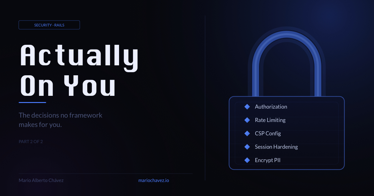 Rails handles framework-level security defaults — but authorization, rate limiting, CSP, session hardening, and encrypted attributes are decisions only you can make.